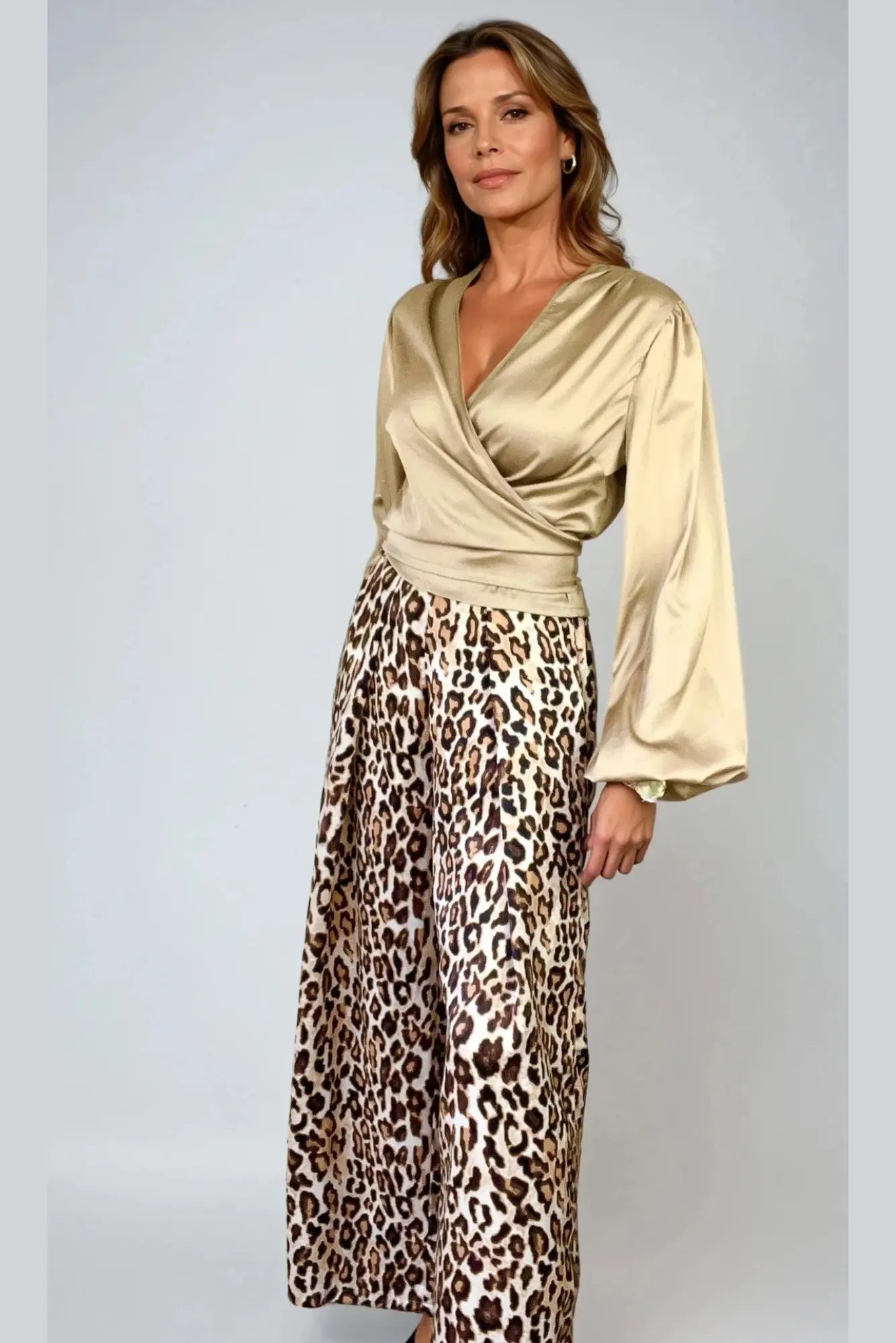 Satin wrap style blouse with balloon sleeves in a gold colour