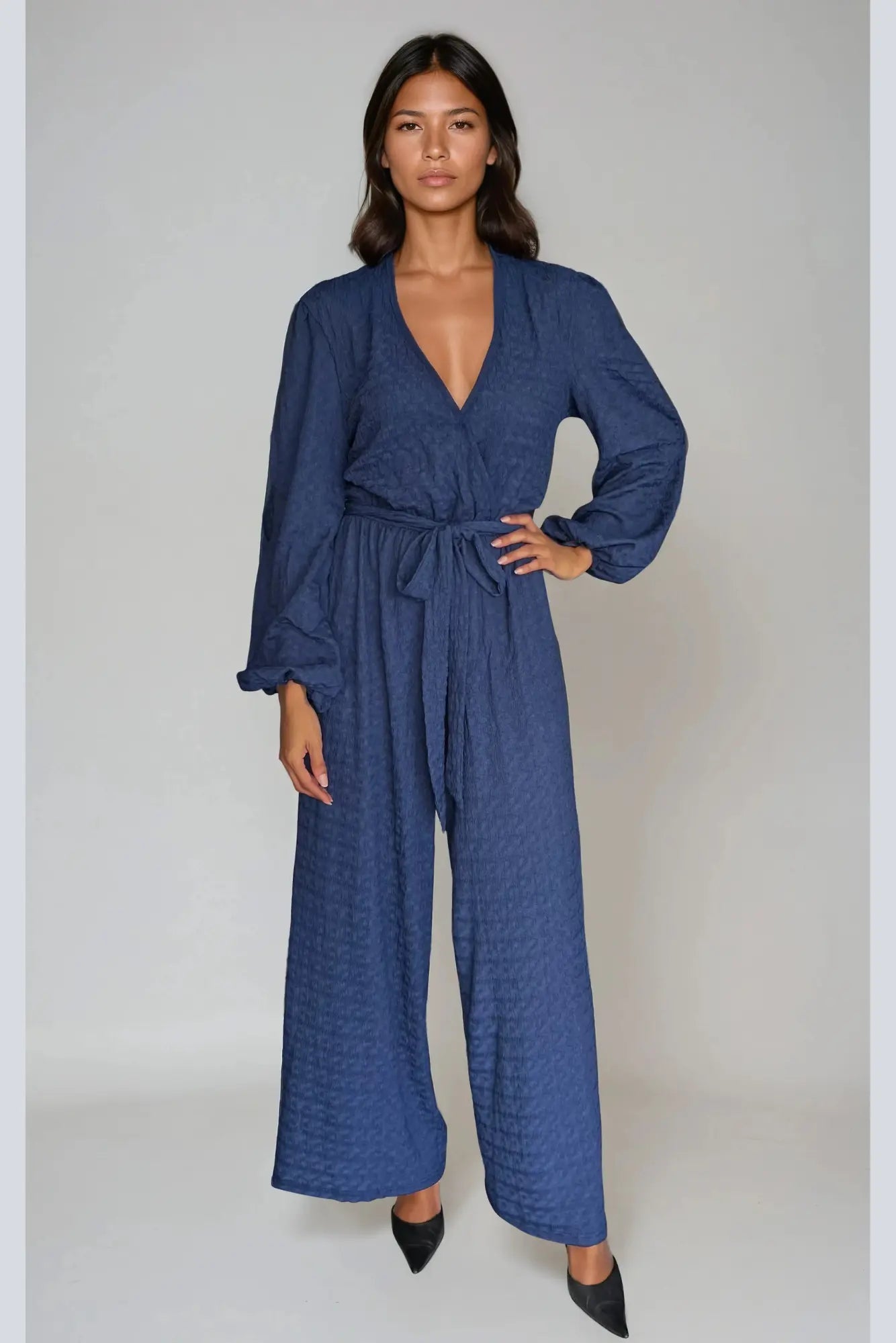 Effortlessly chic, this cross-over jumpsuit is crafted in a lightweight crepe fabric for a sleek, flattering drape. Featuring elegant balloon sleeves with a subtle slit detail, it strikes the perfect balance between modern and timeless. Complete with a matching fabric belt to cinch the waist for a tailored finish.