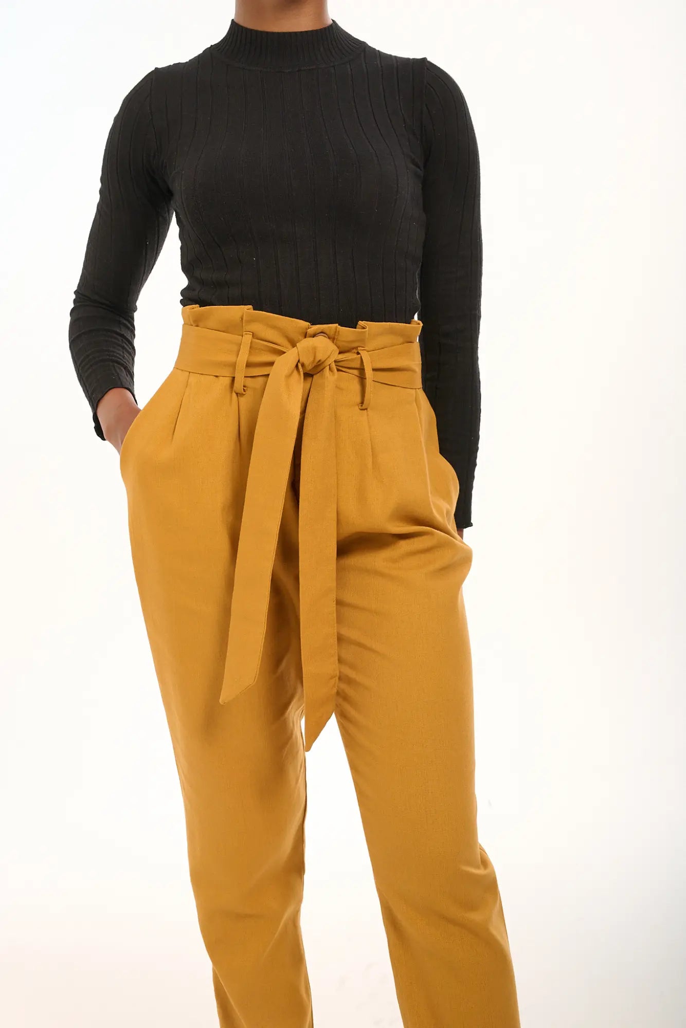 Linen taped pants with a paper bag style waistband in a Mustard colour.
